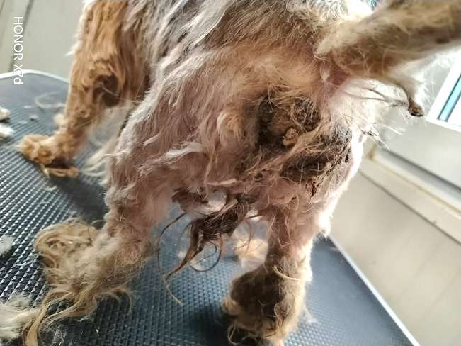 Ihr Fell war total verfilzt, verkotet und voller Flöhe und musste bei allen dreien komplett geschoren werden. Was müssen diese Zoten geziept und die Haut gejuckt haben und das sicher schon eine Ewigkeit. Darüber hinaus waren die Zähne bei allen dreien in einem schlimmen Zustand und es mussten auch einige faulige Exemplare gezogen werden. Die geschätzt im September 2018 geborene Cassy hatte zudem einen vereiterten Wundabszess am Hals. Wo auch immer diese Würmchen bisher gelebt haben, wurden sie absolut vernachlässigt. Doch nun haben sie die Chance, dass sich ihr Leben zum Guten wendet.