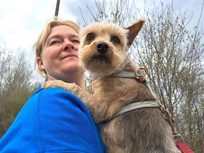 Draußen an der Leine ist sie noch sehr unsicher und bewegt sich nur robbend. Hier braucht sie noch Übung und Routine.
