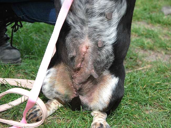 Die geschätzt im Oktober 2018 geborene Picurka wurde Mitte März 2026 mit ihren beiden Welpen Piri und Pola aus sehr schlechter Haltung gerettet. Die arme Maus hatte einen riesigen Mammatumor, der inzwischen operativ entfernt wurde.