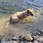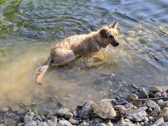 Wally liebt auch Spielzeuge und spielt fröhlich mit uns, kann sich aber auch selbst beschäftigen, v.a. mit Bällen. Und sie liebt das Wasser: Sie plantscht, schwimmt, apportiert Stöckchen und taucht nach Steinen. Das könnte sie wohl stundenlang tun.