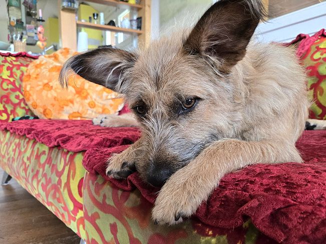 Wally ist nun seit 6 Monaten bei uns. Wir hatten gehofft, dass sich Wally und unser Mischlings-Rüde gut verstehen und zu einem coolen Duo zusammenwachsen würden. Leider geht die Entwicklung in die andere Richtung, denn unser Rüde scheint eher ein Einzelgänger zu sein. Er weicht Wally aus, wo er nur kann, und scheint unglücklich zu sein. Daher haben wir uns schweren Herzens entschieden, ein neues Zuhause für Schmusebacke Wally zu suchen.